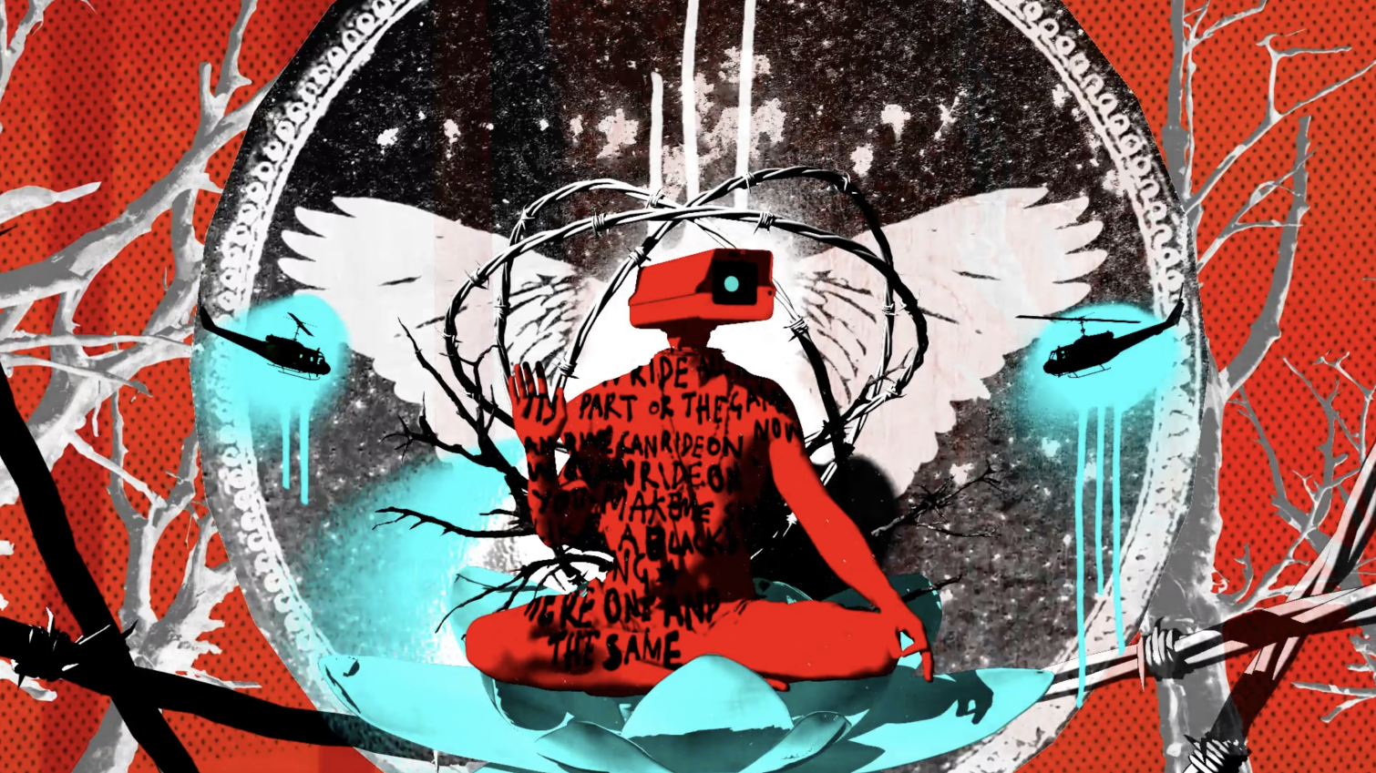 Eight tracks where selected and we dug in making unique videos for each one, but that sat in the same graphic street punk world he was after (four were used for Glastonbury, mixed with simpler BGs to mix up the energy).