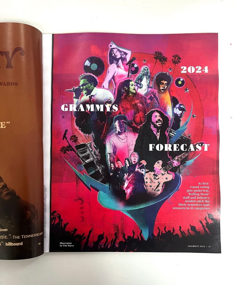 Whether it's a Grammy's forecast (below) or an artist shoutout (above), Tim's memorable style of graphic portraiture has graced the pages of the legendary Rolling Stone magazine a few times this year.
