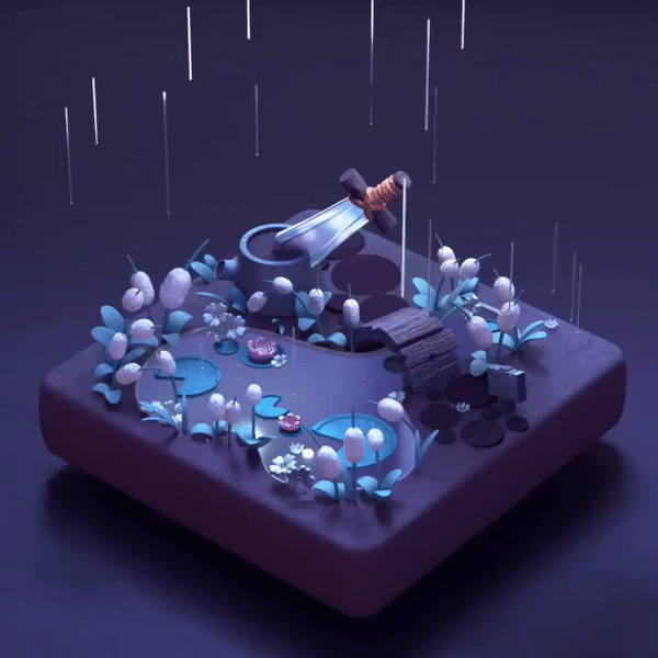 “Pond at Midnight is another sequence in the Rainy Days collection. A pond at midnight where stars fall from the sky during a thunderstorm. The orbs bob and float momentarily before sinking deep below the surface, bringing their glow down with them. The scene is dreamlike, soothing and flooded in silvery moonlight.” The Rusted Pixel