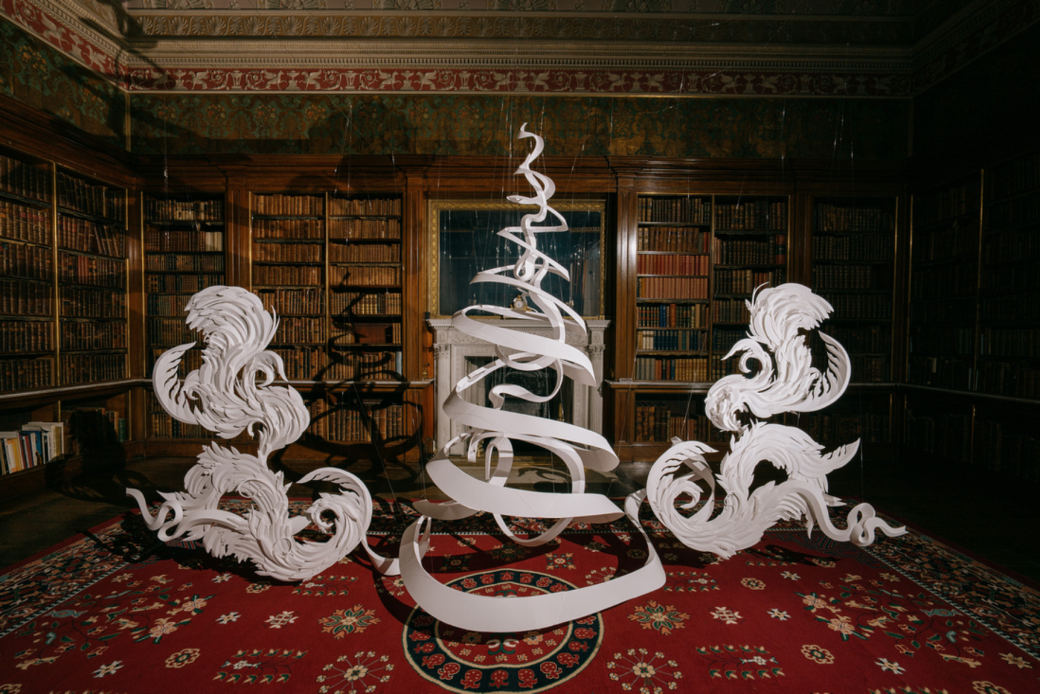 Andy Singleton's untraditional tree takes the form of a spiralling ribbon, unwinding in mid-air. The design is complete with two adorning sculptures, lavishly crafted out of nothing but paper. The exhibition is open to the public from the 12th of November to the 5th of January 2022.
