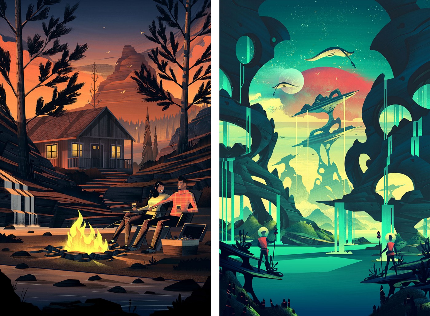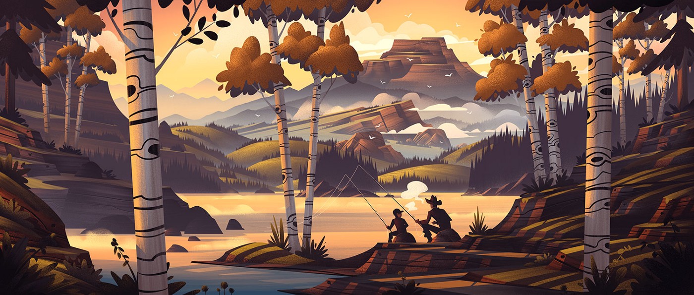 With these posters, I really pushed myself to paint more freely as I attempted to bring every lesson I’d learned as an artist to the work. It felt like a big jump forward creatively and in terms of my craft and at the time I couldn’t be happier with the results. Seeing all of the pieces collected and utilized in a physical board game (crafted with the exceptional quality Keymaster is known for) was simply amazing. The other piece I count as a favourite was my very first screen print called Popgun Summers. This piece was a tribute to my Grandfather and it immortalized the summers I spent with him fishing the mountain lakes of Colorado. It captures the feel of those memories, which harkens back to the concept of hiraeth, and will always be among my favourites.