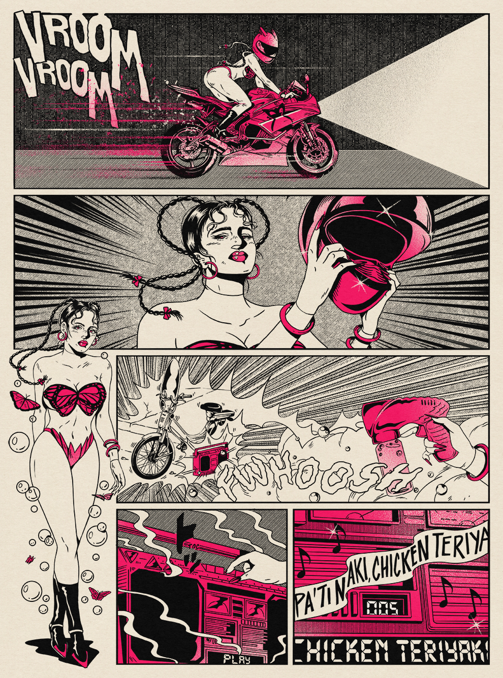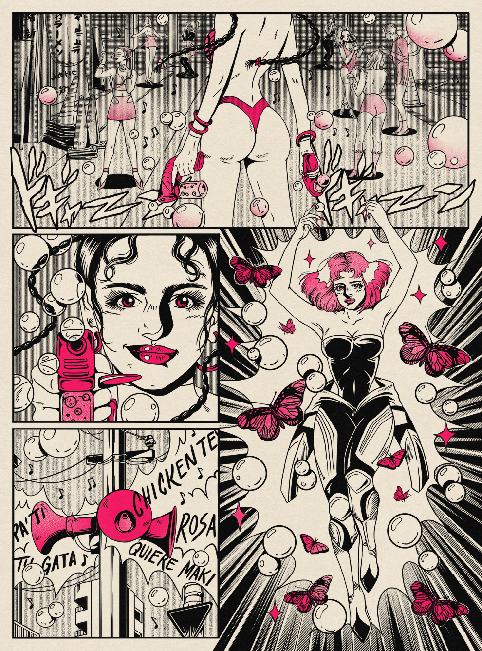 Lola Beltrán is a Spanish graphic artist and illustrator currently based in Valencia, Spain. Lola's style combines anything from comics, manga, animated cartoons, first internet era to classic Hollywood movie posters. Her ability to combine traditional drawing techniques and digital tools, as well as screen printing or lithography, not to mention a huge serving of sass, is truly unique.